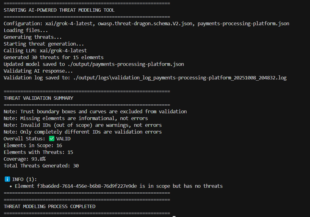 If everything looks good, the threats are added into yourname_of_model.jsonin the/outputfolder. - Final validation + logs